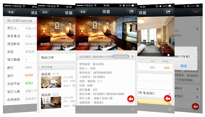 5、提供服務(wù):用戶直接可在公眾賬號(hào)進(jìn)行預(yù)約房間、預(yù)約餐廳等操作。